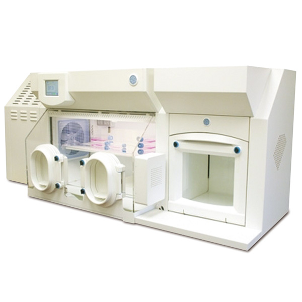 4. 内置大型转移舱,用N2吹洗,转移舱内部体积300mm 长x 300mm宽x 340高mm,可容纳90 个90mm的平皿,或者133块96孔板,或252个T25细胞培养瓶,或18个T175细胞培养瓶;转移闸换气时间五档可调(60s, 120s, 180s, 240s和300s);转移闸内门采用自动升降式设计,不占用内部空间。
